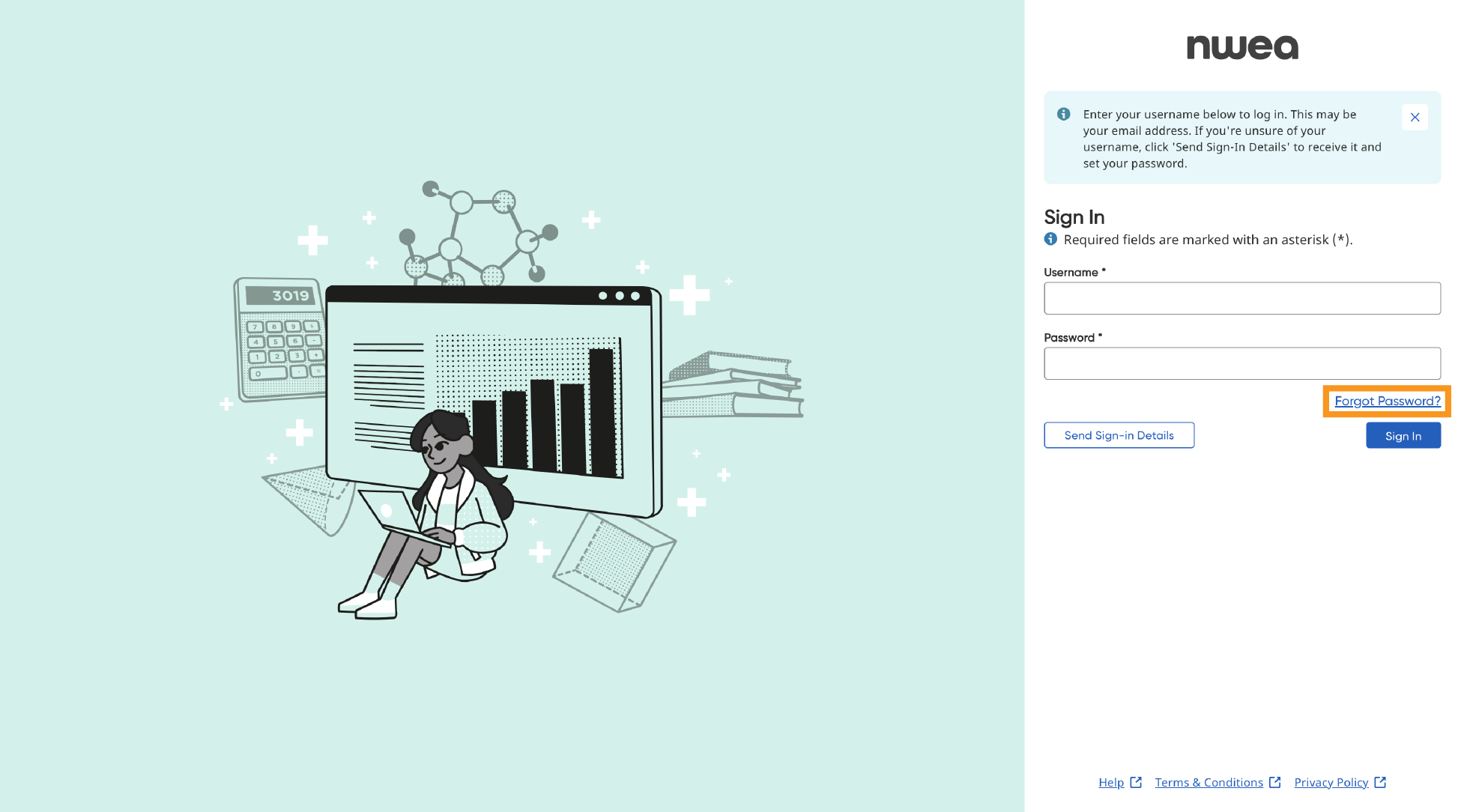 Enter your email and select Submit. Instructions will be sent to your email from noreply@auth.nwea.org.