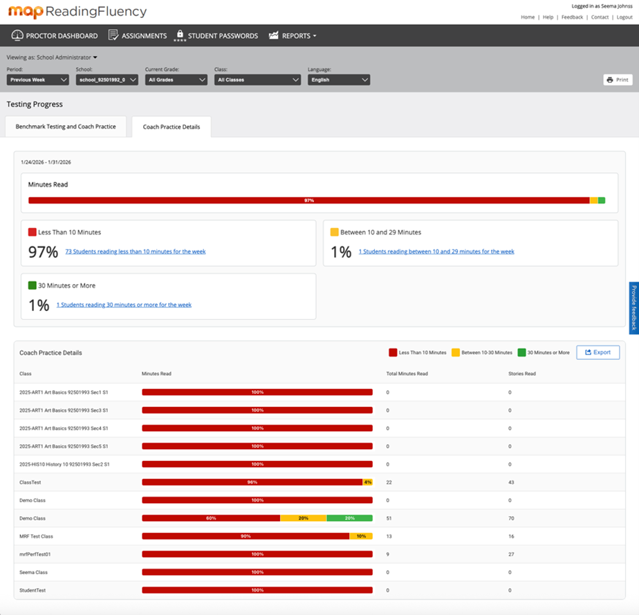 More detailed student Coach usage and results data is available from the Coach tile on the MAP Start Page under MAP Reading Fluency.